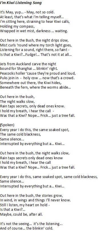 It is a fun song about the pleasures and otherwise of being in the field carrying out kiwi monitoring each year.